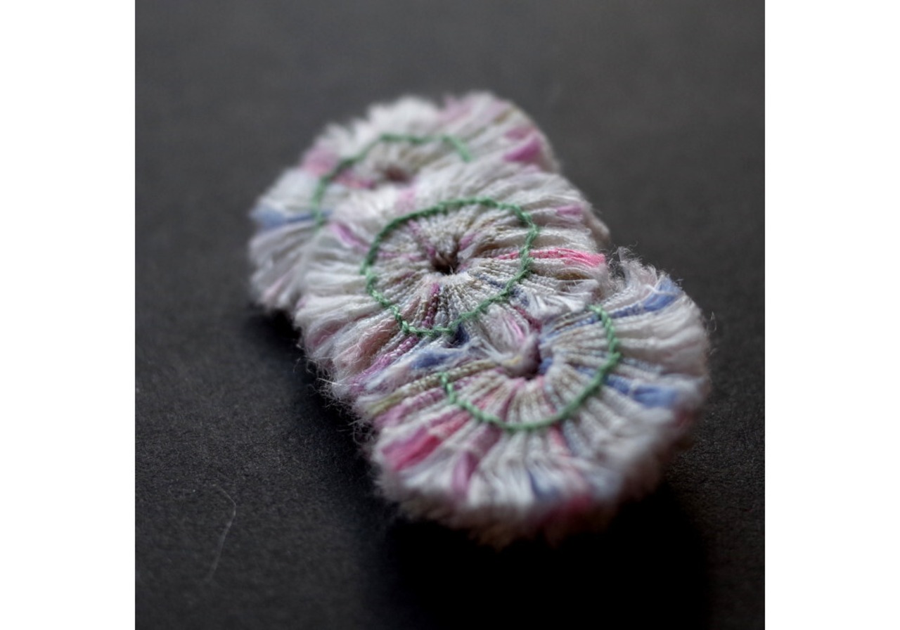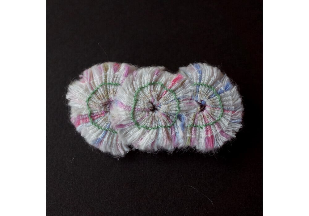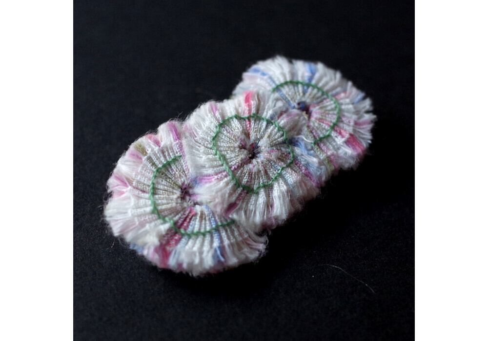 This brooch is made by sewing small pieces of fabric.