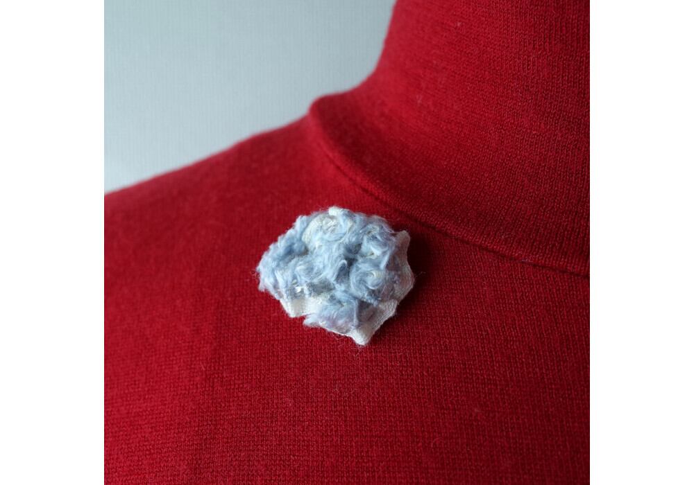 This brooch is made by sewing small pieces of fabric.