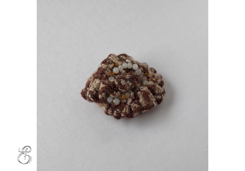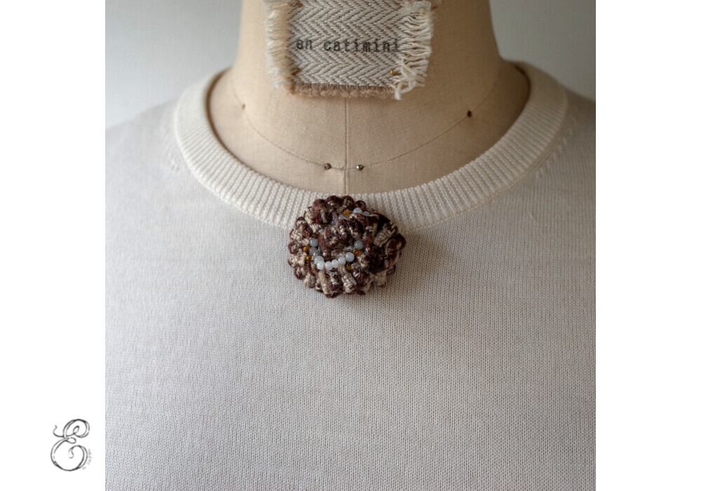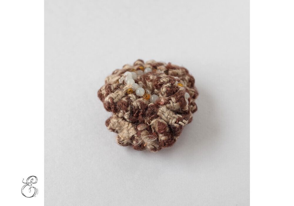This brooch is made by sewing small pieces of fabric.